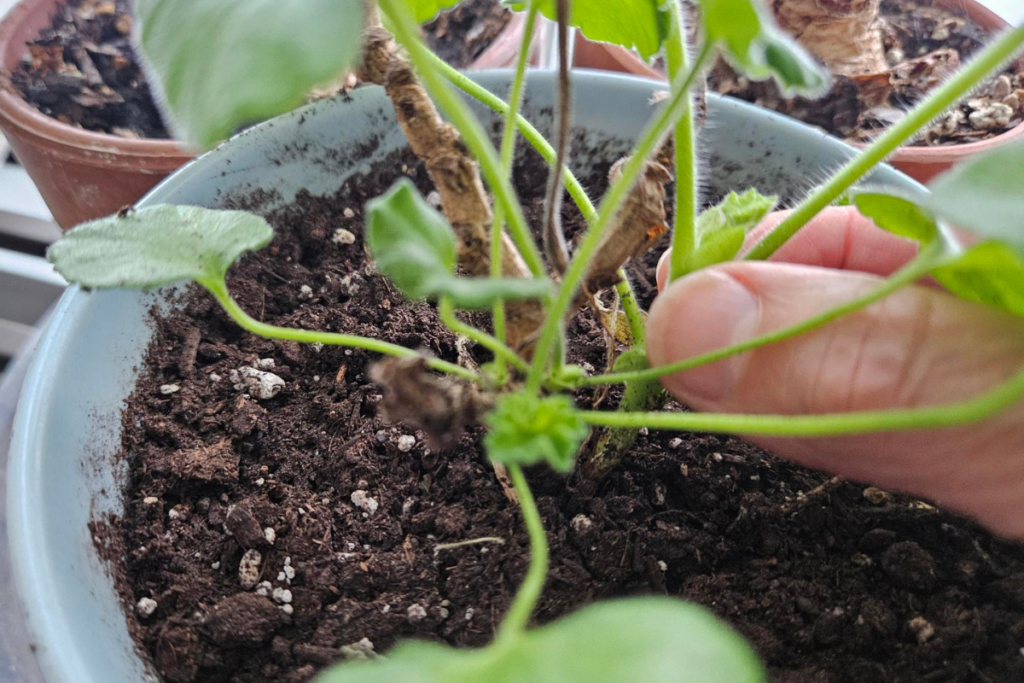 My overwintering geranium has new growth from the roots. Now is the time to start pinching back the newest set of leaves to create more stems and bushier growth.